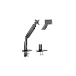17″–43″ monitor dəstəyi | Maks. yük 18 kg | Tilt ±40° | Döndürmə ±90° | Rotasiya ±90° | VESA 75×75, 100×100 (adapterlə 200×100) | Masa qalınlığı 10–84 mm | Qara mat  | 436 mm | 2E.