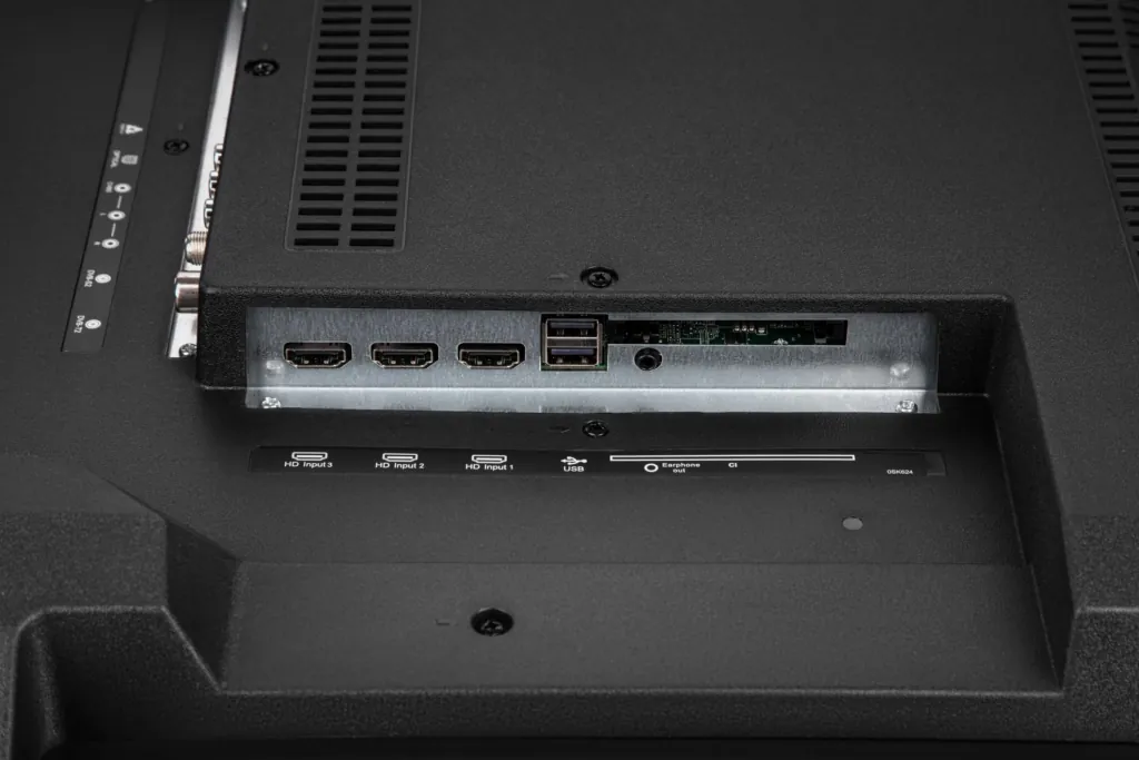 Bağlantı portları kifayət qədər genişdir: 3×HDMI, 2×USB, audio çıxışı, tuner və digər interfeyslər mövcuddur. VESA divar montajı üçün standart 400×300 mm dəstəklənir. Ölçülər ayaqla birlikdə 1448 × 906 × 245 mm, ayaqsız isə 1448 × 832 × 68 mm təşkil edir. Çəkisi təxminən 23.3 kq-dır.