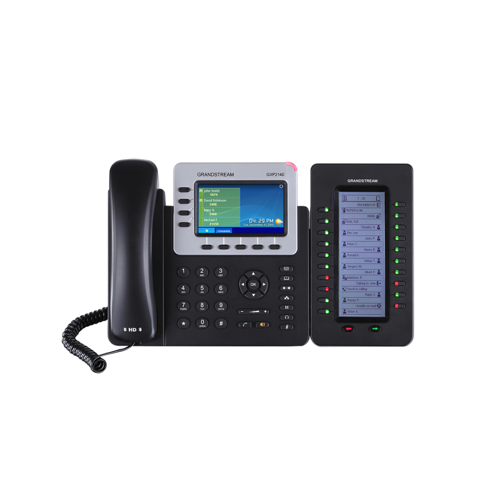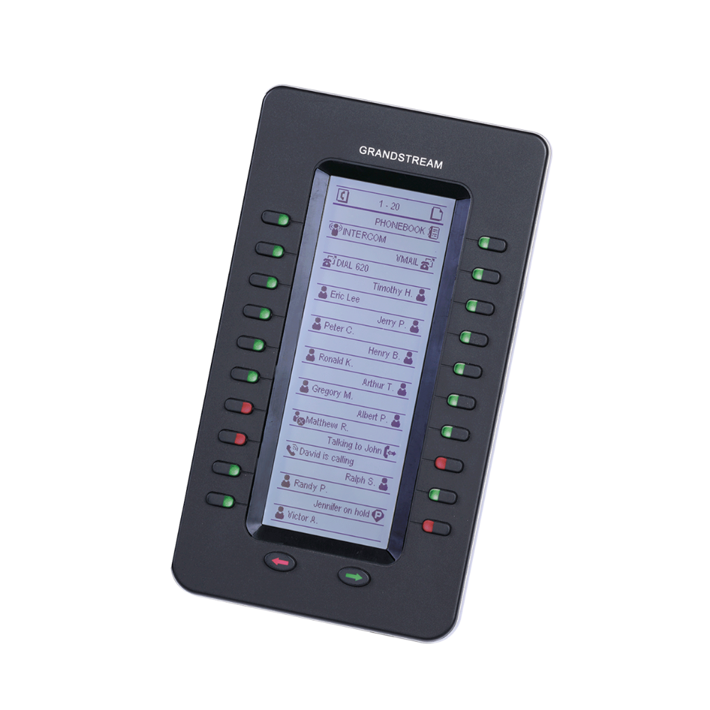 128×384 arxa işıqlı LCD ekran | 20 iki rəngli düymə, 2 səhifə (40 kontakt) | BLF / Sürətli yığım | 4 moduladək qoşulma (160 kontakt) | BLA/SCA, Zəng parkı, Mövcudluq, Interkom, Konfrans / Transfer / Yönləndirmə dəstəyi