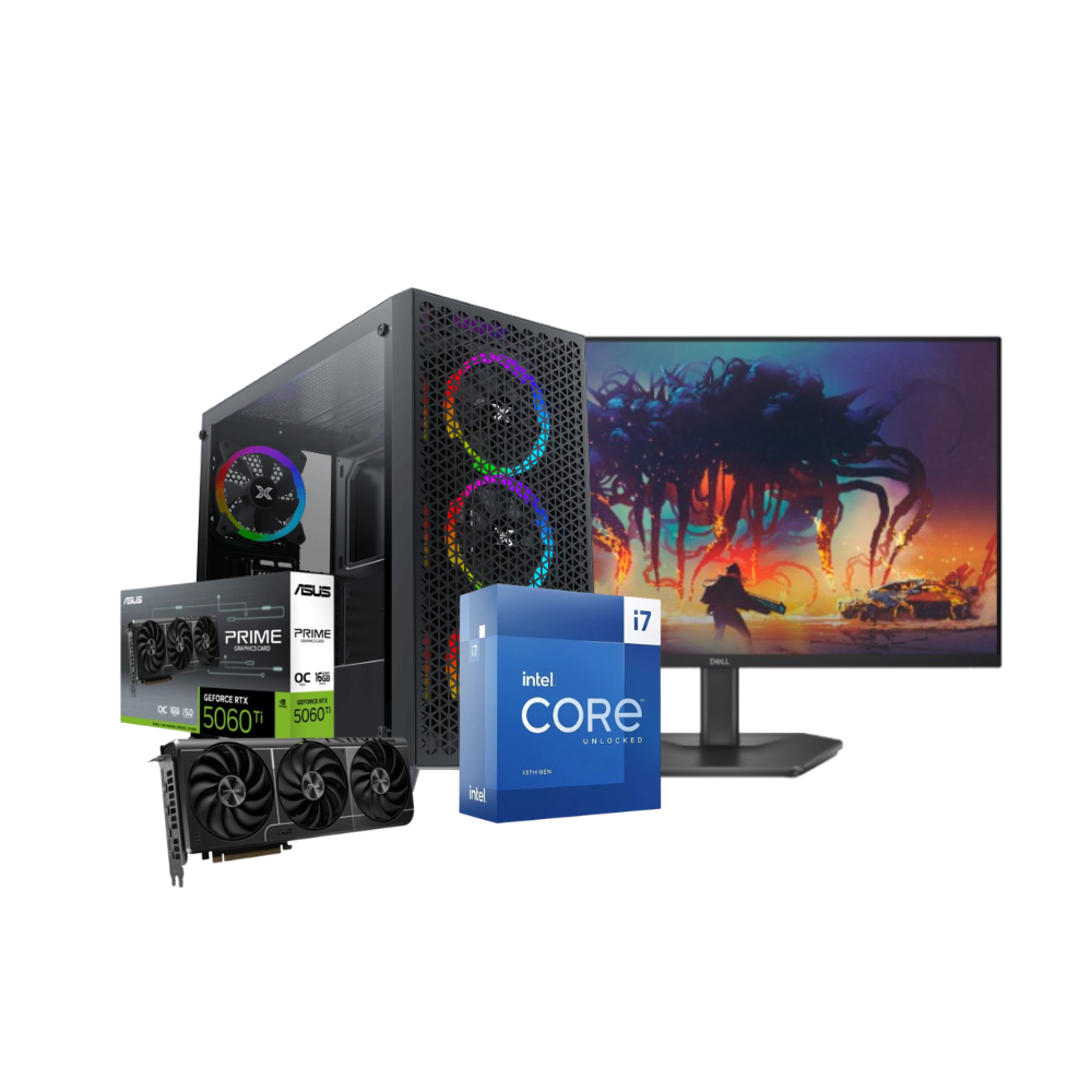 Intel i7-13700KF | ASUS PRIME GeForce RTX 5060Ti 16GB GDDR7 OC Edition | MSI B760M-E DDR5 | T-FORCE VULCAN 16GB DDR5-5600 CL36 | Kingston 1TB NVMe SSD | Frozr-O II 360mm Liquid Cooler | MSI 750W Gold PSU | Gaming G Pro | Dell 24″ 240Hz monitor