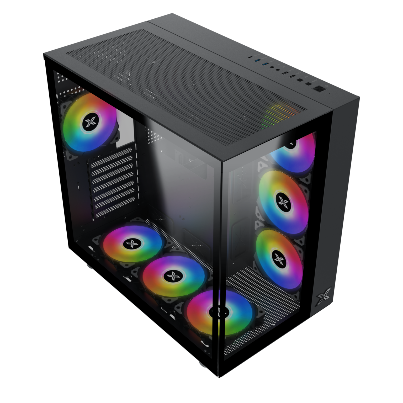 ATX|M‑ATX|ITX dəstək, şüşəli ön + yan panel | 10 fan yeri + RGB idarəedicisi | 460×285×445 mm, 5 kg, PSU ≤220 mm, Front USB 3.0+USB 2.0×2+USB‑C